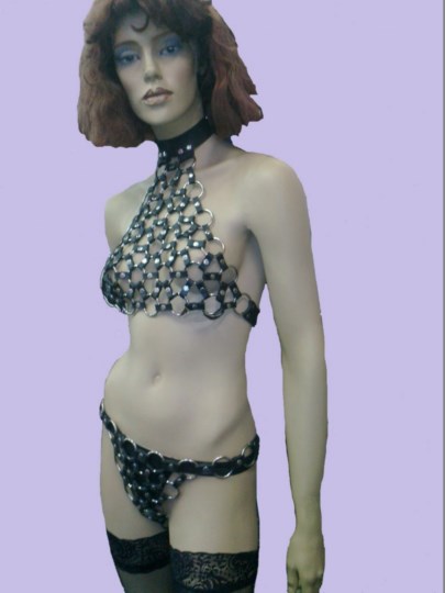 Γυναικείο σύνολο που περιλαμβάνει ένα στρινγκ και ένα σουτιέν. Είναι από δέρμα και υλικά άριστης ποιότητος και αντοχές. Πρωτότυπο σύνολο και με μοναδική κατασκευή. Το σουτιέν είναι με ενωμένους μεταλλικούς κρίκους με δέρμα και σε σχήμα V. Καλύπτουν το στήθος όμορφα και διακριτικά και επίσης το στρινγκ έχει την ίδια φιλοσοφία. Προσελκύστε τον παρτενέρ σας και προκαλέστε σεισμούς στο κρεβάτι.