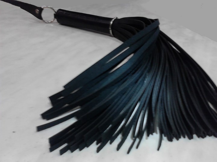 Χονδρό δερμάτινο μαστίγιο που γεμίζει την παλάμη και με πολλές λωρίδες συνολικού μήκους 45 cm. Διαθέτει μεταλλικό διακοσμητικό κρίκο στην μέση της λαβής και με μεταλλικό κρίκο για καλύτερο πιάσιμο.
