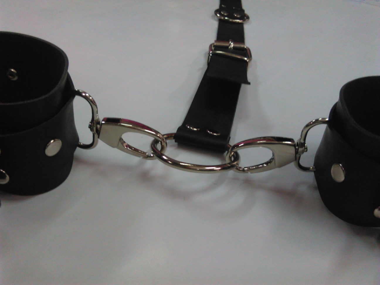 Σετ δεσίματος από δέρμα και υλικά άριστης ποιότητος και αντοχής. Αποτελείται από 2 χειροπέδες, που είναι ανεξάρτητες και αποσπώμενες, με διπλό δέρμα, με φάρδος 6 cm και 3 cm και με μήκος 28 cm. Έχει επίσης συνδετικούς γάντζους, έναν λαιμοδέτη με διπλό δέρμα που είναι συνδεδεμένος με ένα λουρί που καταλήγει σε έναν κρίκο έτσι ώστε να μπορείτε να δέσετε τις χειροπέδες. Μπορείτε επίσης να χρησιμοποιήσετε με πολλούς τρόπους αυτό το σετ, σε πόδια, σε χέρια, μπροστά ή από πίσω.