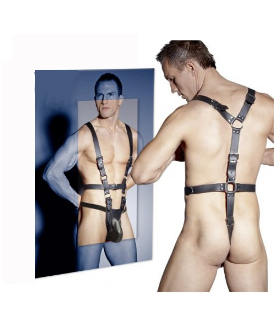 Ανδρικό κορμάκι από δέρμα και υλικά άριστης ποιότητος και αντοχής. Έχει λουριά φάρδους 3 cm και έναν μεταλλικό κρίκο στην πλάτη και στη μέση από πίσω. Δυο λουριά κάθετα μπροστά που ενώνονται σε δερμάτινη επιφάνεια με τρύπα και έναν μεταλλικό κρίκο για το πέος. Όλα τα λουριά έχουν ρυθμιζόμενες τόκες έτσι ώστε να ταιριάζουν σε όλα τα σώματα. Ένα αξεσουάρ δυναμικής ομορφιάς που αγκαλιάζει το γυμνό κορμί σας και του δένει μια διαφορετική αισθητική από την συνηθισμένη.