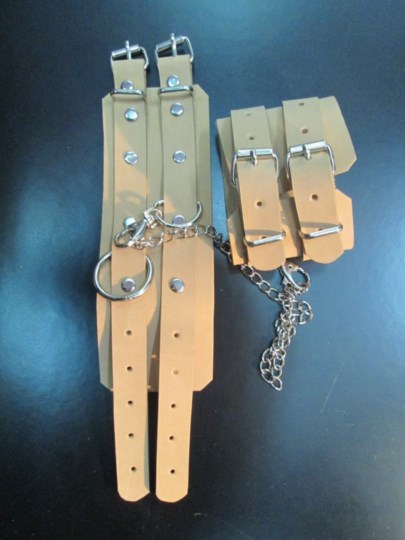 Δερμάτινες χειροπέδες χρώματος μπεζ-καφέ και με διπλό δέρμα. Έχουν φάρδος 7 cm και διπλά ρυθμιζόμενα λουριά με τόκες. Έχουν μήκος 32 cm για καλύτερο και πιο γεμάτο πιάσιμο στον καρπό αλλά και για να μπορείτε να τις χρησιμοποιήσετε και στα πόδια. Διαθέτει και έξτρα αλυσίδα μήκους 30 cm για ακόμη περισσότερες εναλλακτικές στα δεσίματα σας.
