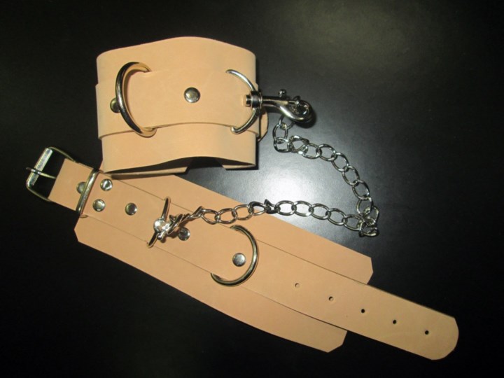 Δερμάτινες χειροπέδες χρώματος μπεζ που είναι ανεξάρτητες και αποσπώμενες. Είναι με διπλό δέρμα φάρδους 6 cm και μήκους 32 cm για να ταιριάζουν και στα πόδια. Διαθέτουν και έξτρα αλυσίδα μήκους 30 cm για περισσότερες επιλογές σε διάφορα δεσίματα.