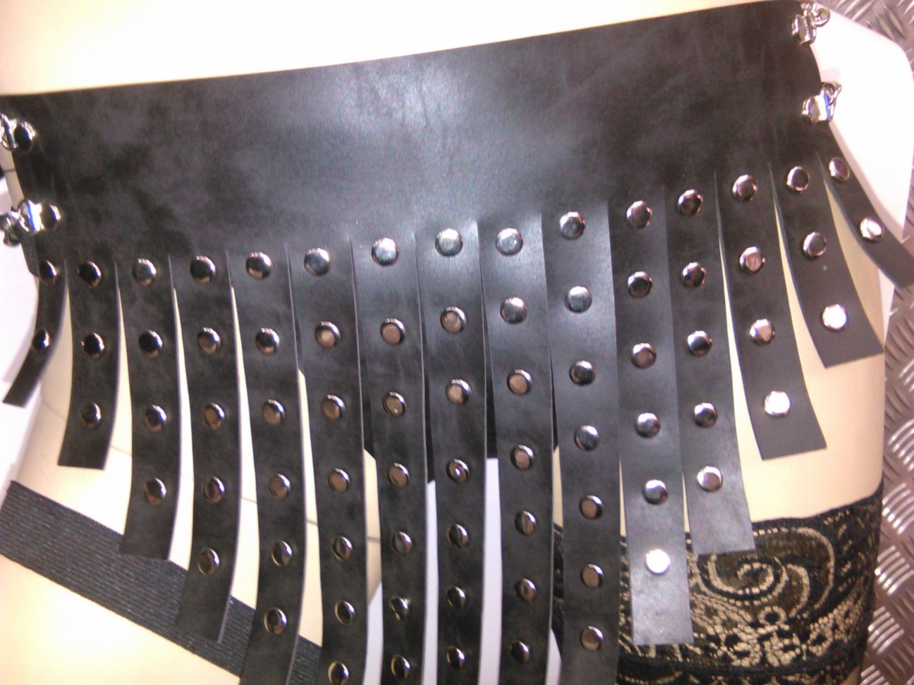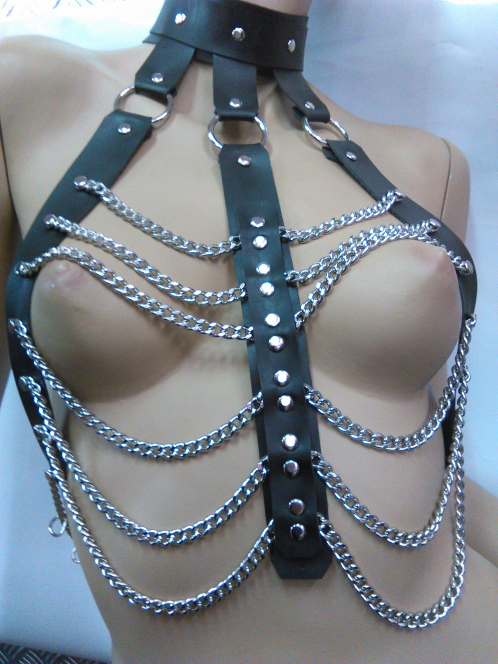 Γυναικείο σύνολο που περιλαμβάνει ένα αξεσουάρ για το στήθος και μια φούστα. Είναι από δέρμα και υλικά άριστης ποιότητος και αντοχής. Το αξεσουάρ για το στήθος διαθέτει περιλαίμιο από όπου ξεκινάνε τα 3 λουριά. Τα λουριά ενώνονται μεταξύ τους διαδοχικά σε διαφορετικός αποστάσεις και σχηματίζουν ένα όμορφο περίγυρο γύρω από το στήθος. Στην φούστα έχει 15 λωρίδες φάρδους 2 cm και είναι διακοσμημένες με ασημένια τρουκς. Πολύ εντυπωσιακή και πρωτότυπη γραμμή για να τον εκπλήξετε.