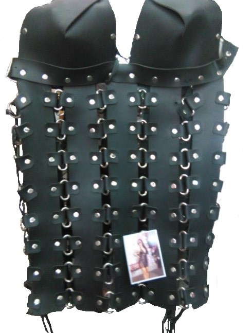 Γυναικείο μίνι φόρεμα από δέρμα και υλικά άριστης ποιότητος και αντοχής. Αποτελείται από 10 συνολικά λουριά, μπρος/πίσω/κάθετα, φάρδους 6,5 cm και μήκους 45 cm και είναι ενωμένα με ρομβοειδή μεταλλικά κρικάκια σε όλη την επιφάνεια. Στα πλαϊνά υπάρχουν κορδόνια για να μπορέσετε να επιτύχετε άριστη εφαρμογή. Το στήθος καλύπτεται άπω 3 λουριά φάρδους 3 cm που ενώνονται με μεταλλικό κρίκο στους ώμους.