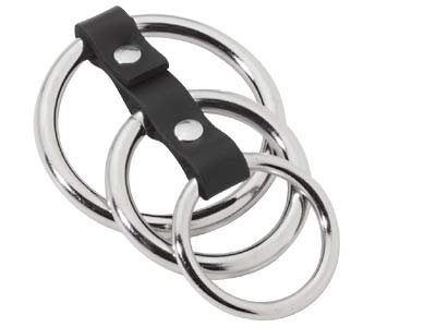 Δακτυλίδι πέους με 3 μεταλλικούς κρίκους και με δερμάτινα ενωτικά. Το πρώτο που είναι και ο πιο χοντρός με διάμετρο 5,5 cm πιάνει τους όρχεις και το πέος και βοηθάει στην καλύτερή στύση και δίνει περισσότερο χρόνο στις ερωτικές δραστηριότητες σας. Ο δεύτερος κρίκος έχει διάμετρο 4 cm και ο τρίτος 3,5 cm που αγκαλιάζουν το πέος και το διατηρούν πιο σκληρό.