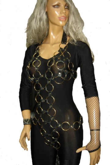 Γυναικείο κορμάκι με χρυσούς κρίκους και χρυσά τρουκς. Αποτελείται από κρίκους διαμέτρου 4,5 cm και προσαρμόζεται σε όλα τα σώματα. Δώστε μια δυναμική ώθηση στην φαντασία σας και τολμήστε να δοκιμάσετε νέες ερωτικές διεξόδους.