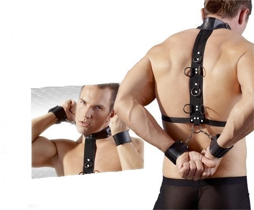 Σετ δεσίματος από δέρμα και άλικα άριστης ποιότητος και αντοχής. Διαθέτει ένα περιλαίμιο φάρδους 6 cm με λουρί προς τα κάτω που διαθέτει 5 ενσωματωμένες σειρές με μεταλλικούς χαλκάδες. Επίσης έχει μια ζώνη στην μέση με φάρδος 2,5 cm. Επίσης διαθέτει και 2 χειροπέδες φάρδους 6 cm, είναι ανεξάρτητες και ενώνονται μεταξύ τους ή με άλλα σημεία με ενωτικούς μεταλλικούς γάντζους. Το σετ αυτό μπορεί να χρησιμοποιηθεί είτε από την μπροστινή πλευρά είτε από την πίσω πλευρά σας. Μπορείτε να τα δέσετε σε όποιο σημείο εσείς επιθυμείτε.
