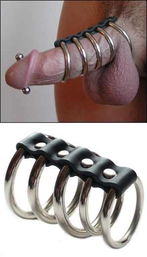 Δακτυλίδι πέους από δέρμα και υλικά άριστης ποιότητος και αντοχής. Αποτελείτε από 5 μεταλλικούς κρίκους που συνδέονται με δερμάτινο λουράκι στο πάνω μέρος. Ο πρώτος κρίκος είναι χοντρός και φαρδύς και με διάμετρο 5 cm. Οι επόμενοι 3 έχουν φάρδος 4 cm και ο τελευταίος έχει φάρδος 3 cm. Το πρώτο μεγάλο δακτυλίδι πέους πιάνει τους όρχεις και το πέος που βοηθάει στην καλύτερη στύση και στην περισσότερη διάρκεια στις ερωτικές πράξεις σας.