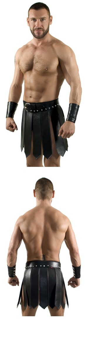 Ανδρική φούστα σκληρής οπτικής, ''Σπάρτακος''. Είναι από δέρμα και υλικά άριστης ποιότητος και αντοχής. Διακοσμημένη στη ζώνη με ασημένια τρουκς και πολλές φαρδιές λωρίδες στη φούστα με μυτερή κατάληξη. Είναι προσαρμοζόμενη και ταιριάζει σε όλα σχεδόν τα σώματα. Δώστε μια διαφορετικότητα στην εμφάνισή σας ταράζοντας τα συνηθισμένα συμβάντα.