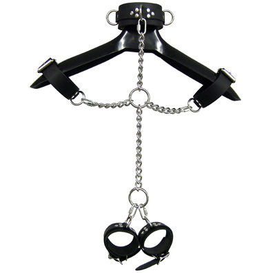 Σετ δεσίματος από δέρμα και υλικά άριστης ποιότητος και αντοχής. Αποτελείται από έναν λαιμοδέτη με διπλό δέρμα φάρδους 5 cm X 3c m και με 3 μεταλλικούς κρίκους. Οι χειροπέδες για τα μπράτσα είναι με μονό δέρμα φάρδους 3 cm και οι χειροπέδες για τον καρπό είναι με διπλό δέρμα φάρδους 5 cm X 3 cm με μεταλλικούς κρίκους. Διαθέτει χοντρή αλυσίδα σε σχήμα σταυρού με συνδετικά στρογγυλά κρικάκια που ενώνονται με τις χειροπέδες. Οι ενώσεις γίνονται με μεταλλικούς βιδωτούς γάντζους. Ένα ολοκληρωμένο σετ για πολλαπλά και ποικιλότροπα δεσίματα.