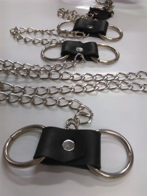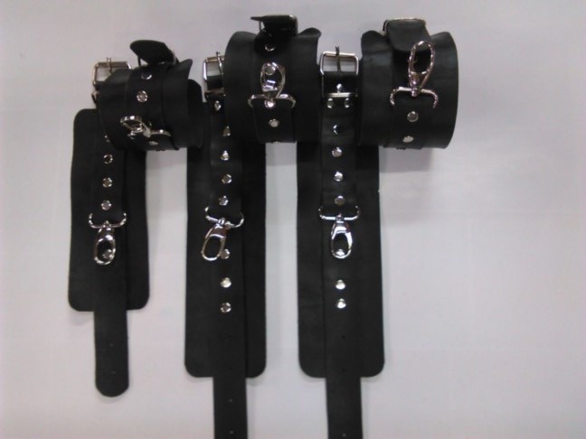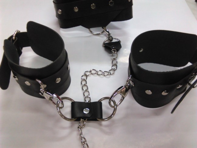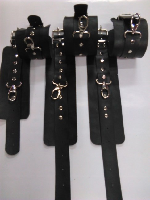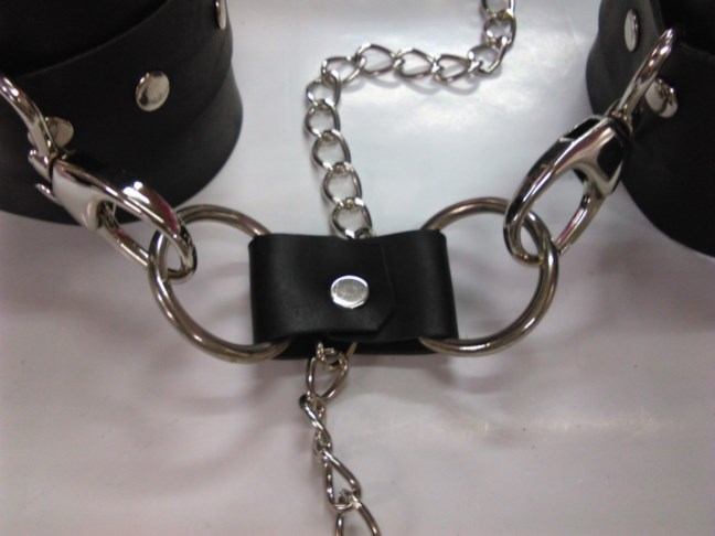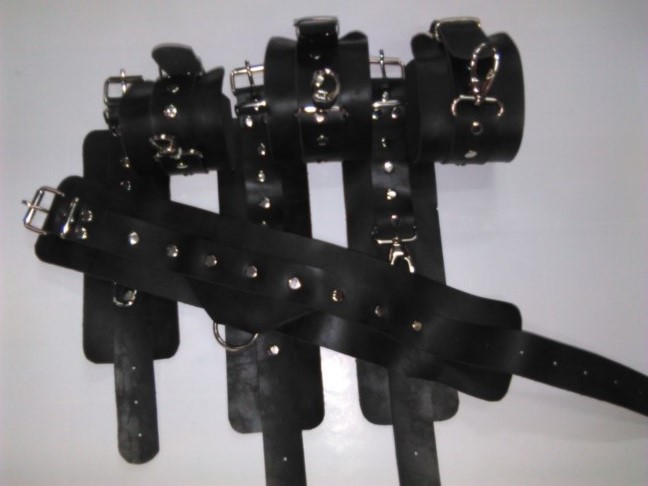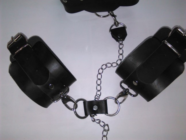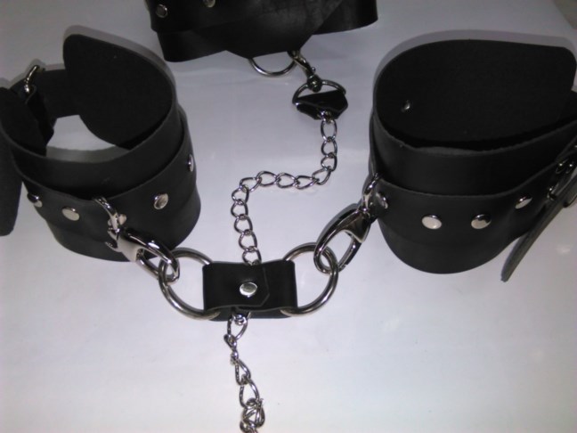 Σετ δεσίματος από δέρμα και υλικά άριστης ποιότητος και αντοχής. Ένα πολυδιάστατο και ολοκληρωμένο σετ για πολλά και ατελείωτα δεσίματα. Αποτελείται από 6 χειροπέδες φάρδους 7 cm, με διπλό δέρμα και διακοσμητικά ασημένια τρουκς σε όλη την επιφάνεια. Η κάθε χειροπέδα διαθέτει συνδετικούς γάντζους. Οι χειροπέδες είναι ανεξάρτητες και αποσπώμενες και είναι για το μπράτσο, τον καρπό και τα πόδια. Διαθέτει φαρδύ περιλαίμιο και αλυσίδα που ξεκινά από το περιλαίμιο, φτάνει μέχρι τα πόδια και έχει συνδετικούς κρίκους στην πλάτη, στην μέση και κάτω στα πόδια για να μπορούν να πιαστούν οι χειροπέδες από πίσω ή από μπροστά αναλόγως με το τι επιθυμείτε. Μπορείτε να κάνετε πολλές εναλλαγές στα ερωτικά σας δεσίματα αφού κάθε κομμάτι είναι ανεξάρτητο.