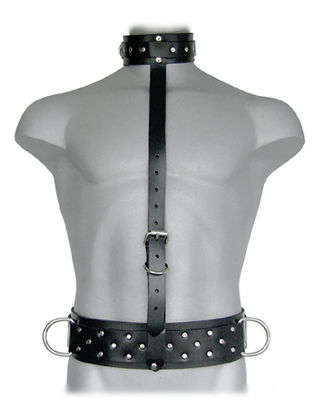Δερμάτινο αξεσουάρ από δέρμα και υλικά άριστης ποιότητος και αντοχής. Αποτελείται από έναν λαιμοδέτη με διπλό δέρμα και είναι διακοσμημένο με ασημένια τρουκς. Έχει επίσης και ένα λουρί που είναι ενσωματωμένο προς τα κάτω με ρυθμιζόμενη τόκα που καταλήγει σε μια εντυπωσιακή ζώνη με διπλό δέρμα φάρδους 8 cm. Είναι διακοσμημένη με τρουκς και δυο μεγάλους μεταλλικούς κρίκους στα πλαϊνά.