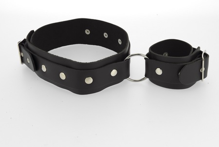 Δεσίματα από δέρμα και υλικά άριστης ποιότητος και αντοχής. Αποτελείται από μια χειροπέδα με διπλό δέρμα φάρδους 5 cm και 3 cm που ενώνεται με έναν μεταλλικό κρίκο σε μια ζώνη στον μηρό. Μονόπλευρο δέσιμο για ιδιαίτερες επιλογείς στα ερωτικά παιχνίδια σας.