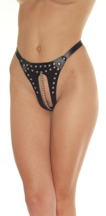 Γυναικείο αξεσουάρ από δέρμα και υλικά άριστης ποιότητος και αντοχής. Γυναικείο αξεσουάρ-εσώρουχο με άνοιγμα στην μέση και με αλυσίδα φραγής. Διαθέτει διακοσμητικά τρουκς στην επιφάνεια και ελαστικό πιάσιμο στη μέση.