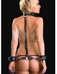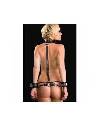 Δερμάτινο σετ δεσίματος που περιλαμβάνει ένα περιλαίμιο και χειροπέδες για τα χέρια. Το περιλαίμιο έχει διπλό δέρμα με φάρδος 6 cm και 3 cm και έχει ένα ενσωματωμένο λουρί που καταλήγει σε μεταλλικό κρίκο. Οι δυο χειροπέδες έχουν διπλό δέρμα φάρδους 6 cm και 3 cm και η καθεμιά έχει μεταλλικό γάντζο για να δένονται στον μεταλλικό κρίκο. Μπορείτε να χρησιμοποιήσετε είτε από την μπροστινή μεριά είτε από πίσω καθώς και ως δέσιμο ποδιών για ακόμη μεγαλύτερο βαθμό δυσκολίας στα ερωτικά παιχνίδια σας.