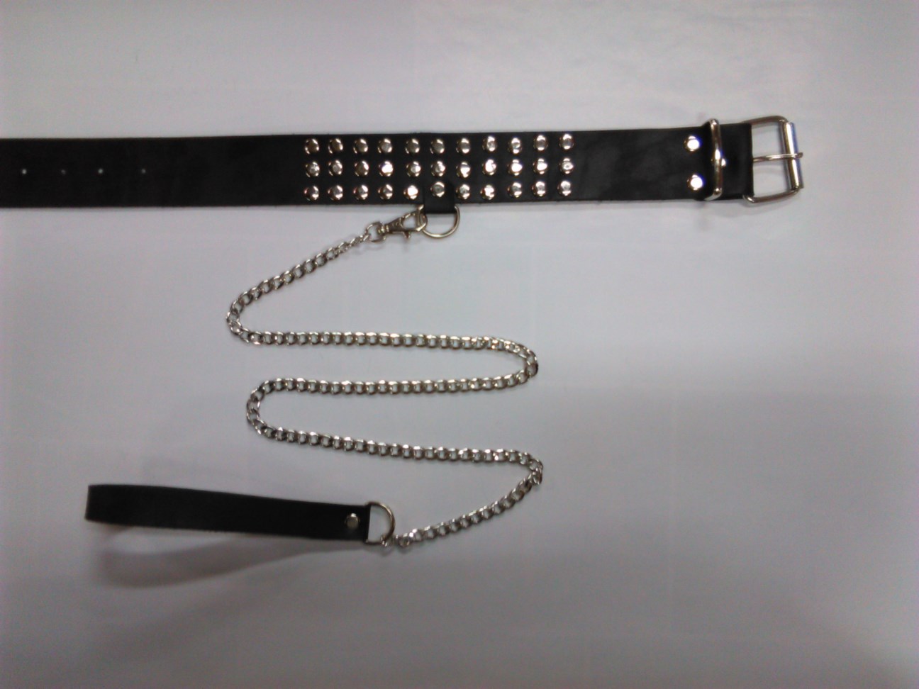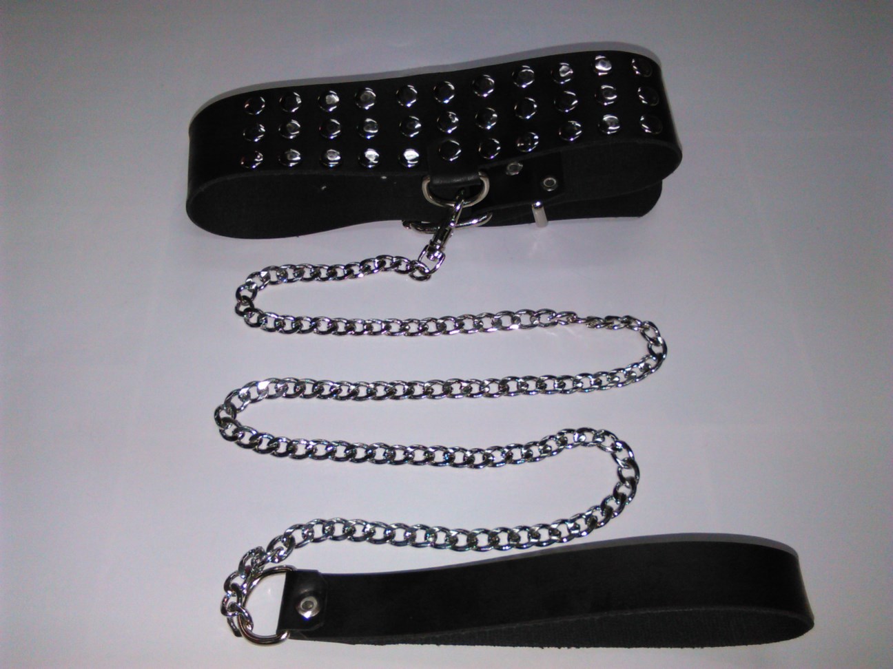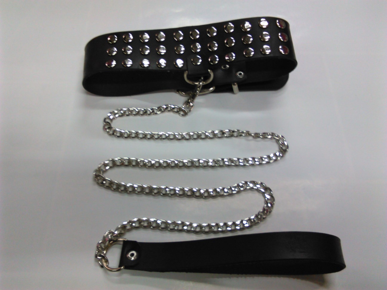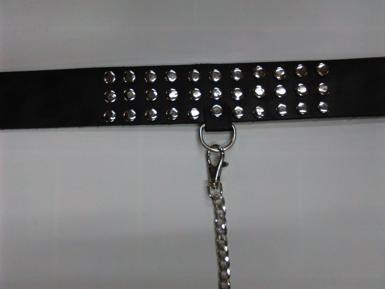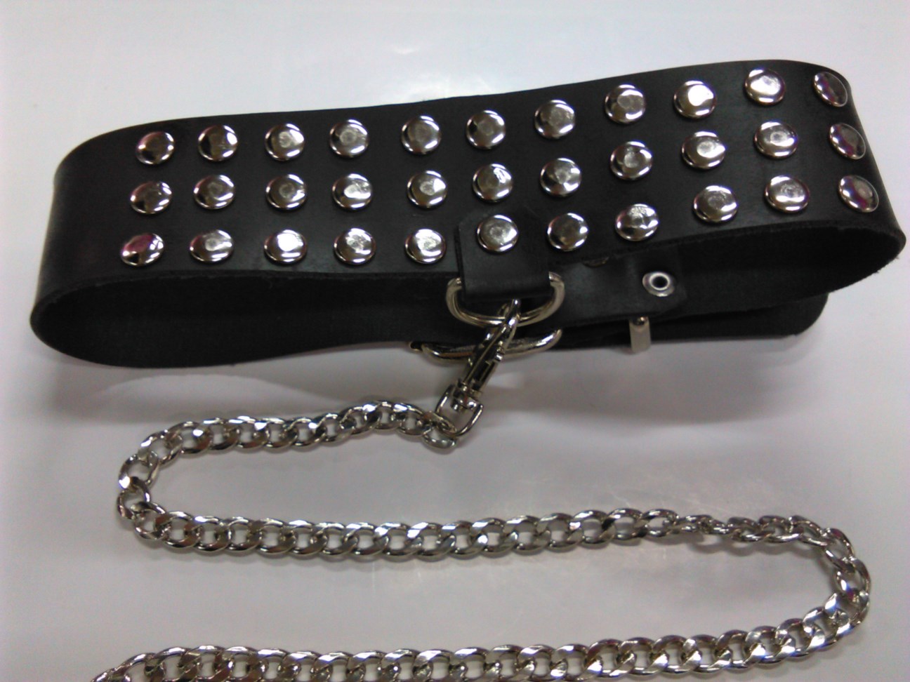 Λαιμοδέτης με αλυσίδα και με δέρμα άριστης ποιότητος και αντοχής. Έχει φάρδος 4 cm, με 33 διακοσμητικά τρους σε τριάδες και με ένα κεντρικό κρικάκι στη μέση. Διαθέτει και αλυσίδα πολυτελείας με δερμάτινο λουράκι στην κατάληξή.