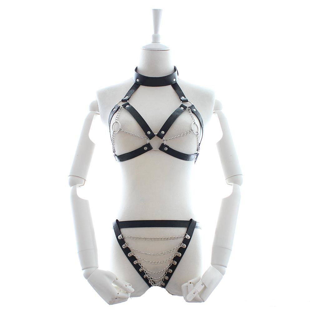 Δερμάτινο σουτιέν με στρινγκ. Το σουτιέν έχει λουριά φάρδους 2,5 cm και εσωτερικές αλυσίδες που ενώνονται με έναν μεταλλικό κεντρικό κρίκο. Το σουτιέν είναι ενωμένο με ένα περιλαίμιο που έχει φάρδους 3 cm και έχει τριγωνικό σχέδιο σε φαρδιά γραμμή. Το στρινγκ διακοσμείται με οριζόντιες αλυσίδες.