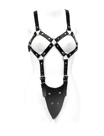 Δερμάτινο κορμάκι που αποτελείται από λουριά φάρδους των 2,5 cm που αγκαλιάζουν το στήθος. Κάτω από το στήθος ξεκινούν δύο λουράκια με προσαρμοζόμενες τόκες που καταλήγουν σε ένα γεμάτο στρινγκ.