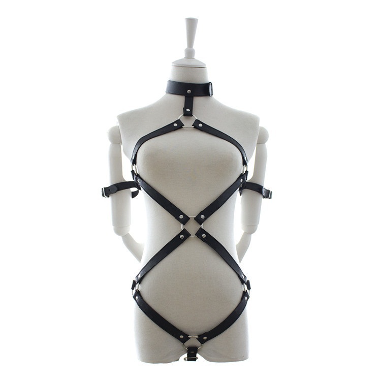 Δερμάτινο κορμάκι με περιλαίμιο φάρδους 3 cm και με δυο ρομβοειδή σχέδια στο κορμί σας με λουράκια φάρδους 2,5 cm. Διαθέτει ενσωματωμένες χειροπέδες στα πλάγια του στήθους έτσι ώστε να υπάρχει απόλυτος έλεγχος στα χέρια.