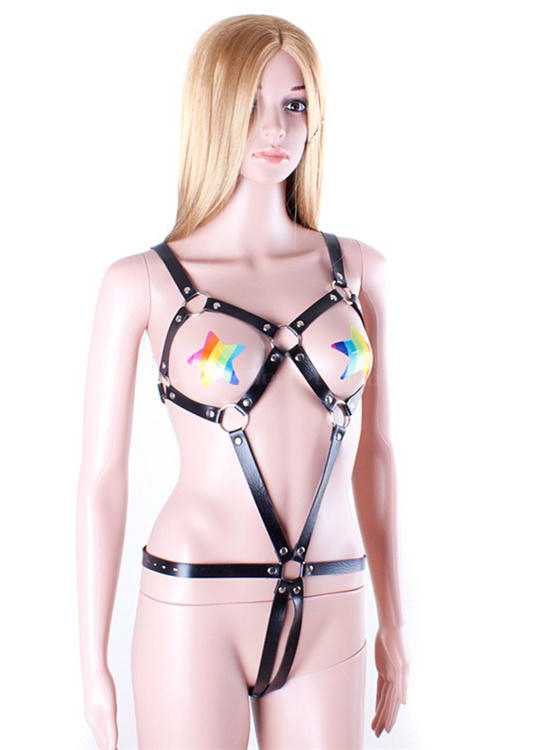 Δερμάτινο ολόσωμο αξεσουάρ σώματος με λουριά φάρδους των 2,5 cm και είναι γεωμετρικά ενωμένα με μεταλλικούς κρίκους.