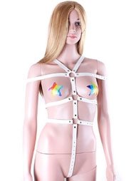 Ολόσωμο δερμάτινο αξεσουάρ σώματος με κάθετα και οριζόντια λουράκια. Έχουν φάρδος 2,5 cm και είναι άσπρου χρώματος. Δώστε μια διαφορετική διάσταση στην εμφάνισή σας.