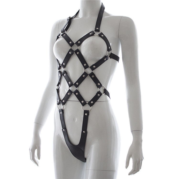 Γυναικείο δερμάτινο κορμάκι με λουριά φάρδους 2,5 cm, με ρομβοειδή σχήματα και με σλιπ στο τελείωμα. Δίνει μία γεωμετρική ομορφιά στο κορμί σας και τελειοποιεί τις γραμμές του σώματος. Αλλάξτε συνήθειες και δώστε μία νέα δυναμική στην εμφάνιση και στα ερωτικά παιχνίδια σας.