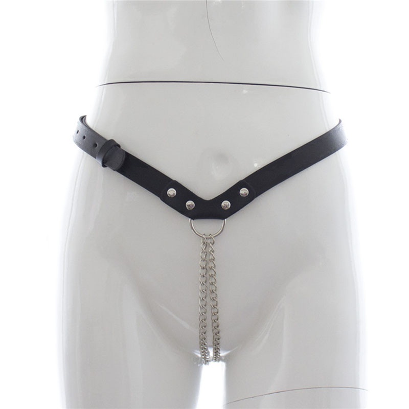 BDSM Δερμάτινο γυναικείο σλιπ. Αποτελείται από μία ζώνη φάρδους 2,5cm που στο κεντρικό σημείο έχει έναν μεταλλικό κρίκο με 4 τρουκς και 2 αλυσιδες που πηγαίνουν ανάμεσα στα πόδια. Ένα απλό αλλά έξυπνο αξεσουάρ στο γυναικείο σώμα.