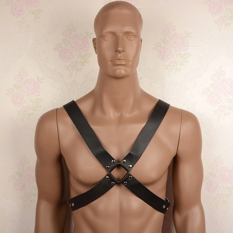 BDSM Δερμάτινο ανδρικό τοπ. Αξεσουάρ για το αντρικό στήθος με λουριά φάρδους 4 cm. Έχει 4 λουριά σε σχήμα Χ που ενώνονται σε ένα κεντρικό μεταλλικό κρίκο στη μέση του στήθους. Δυναμική προσέγγιση στις ερωτικές περιπτύξεις σας.