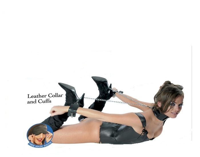BDSM Δερμάτινο σετ δεσίματος που περιλαμβάνει ένα περιλαίμιο, χειροπέδες και μια μάσκα ολικής κάλυψης. Το περιλαίμιο είναι φάρδους 5 cm με ενωτικό τριγωνάκι στη μέση και διακοσμητικά τρουκς. Οι 2 χειροπέδες είναι φάρδους 5 cm και ενώνονται με το περιλαίμιο με 2 αλυσίδες μήκους 70 cm η καθεμία. Επίσης, το σετ περιλαμβάνει μια μάσκα ολικής κάλυψης ματιών.