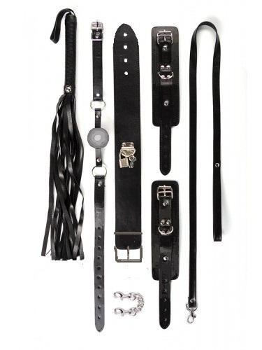 BDSM Μαύρο δερμάτινο σετ που περιλαμβάνει χειροπέδες, δέστρες χεριών-ποδιών, ενωτική αλυσίδα, μαστίγιο, φίμωτρο και ένα περιλαίμιο.  Περιλαμβάνει: