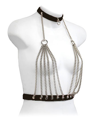 BDSM Μπούστο με δερμάτινες λεπτομέρειες και με αλυσίδες. Διαθετει περιλαίμιο και ζώνη φάρδους 2,5 cm. Από το περιλαίμιο ξεκινούν δυο αλυσίδες οι οποίες συγκρατούν τις έξι αλυσίδες που καλύπτουν νοητά το στήθος σας. Ενα αισθησιακό αξεσουάρ που δίνει μια ιδιαίτερη και εντυπωσιακή ομορφιά στην εμφάνισή σας!
