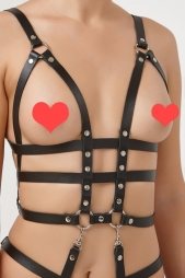 BDSM Δερμάτινο κορμάκι με ζαρτιέρες και με άνοιγμα στο στήθος. Αποτελείται από λουράκια φάρδους 2 cm που είναι ενωμένα με μεταλλικούς κρίκους. Έχει λουράκια γύρω από το στήθος, 3 λουράκια σαν ζώνες κάτω από το στήθος, χιαστή σχέδιο πιο κάτω και 2 λουράκια σαν ζαρτιέρες στους μηρούς. Ενώνονται με μεταλλικούς μικρούς γάντζους. Ταιριάζει σε όλα τα σώματα διότι έχει προσαρμοζόμενες τόκες.