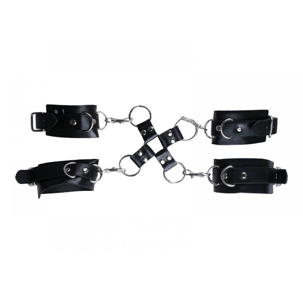 BDSM Δερμάτινο σετ δεσίματος με 4 χειροπέδες χεριών/ποδιών. Έχει διπλό δέρμα φάρδους 4,5 + 2,5 cm, με διπλό μεταλλικό κρίκο και με γάντζο η καθεμία. Διαθέτει ενωτικό σταυρό για πολλαπλά δεσίματα. Μπορείτε να τις χρησιμοποιήσετε και μεμονωμένα. Δώστε κίνητρα και λύσεις στα ερωτικά παιχνίδια σας!