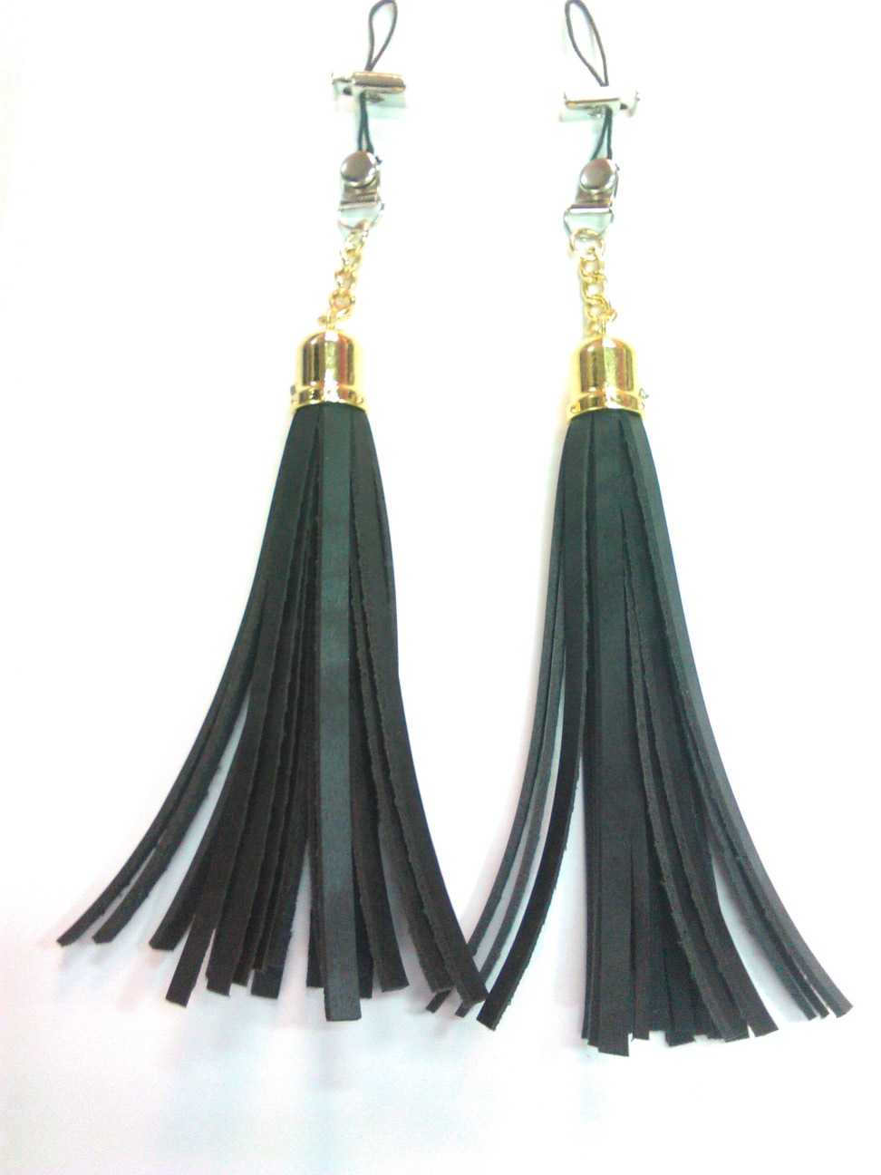 BDSM Σφιγκτήρες θηλών με μικρά δερμάτινα μαστίγια σε χρυσές θήκες και με ρυθμιζόμενο σφίξιμο. Μια όμορφη προσθήκη στο στήθος σας που θα τραβήξει το βλέμμα του συντρόφου σας.