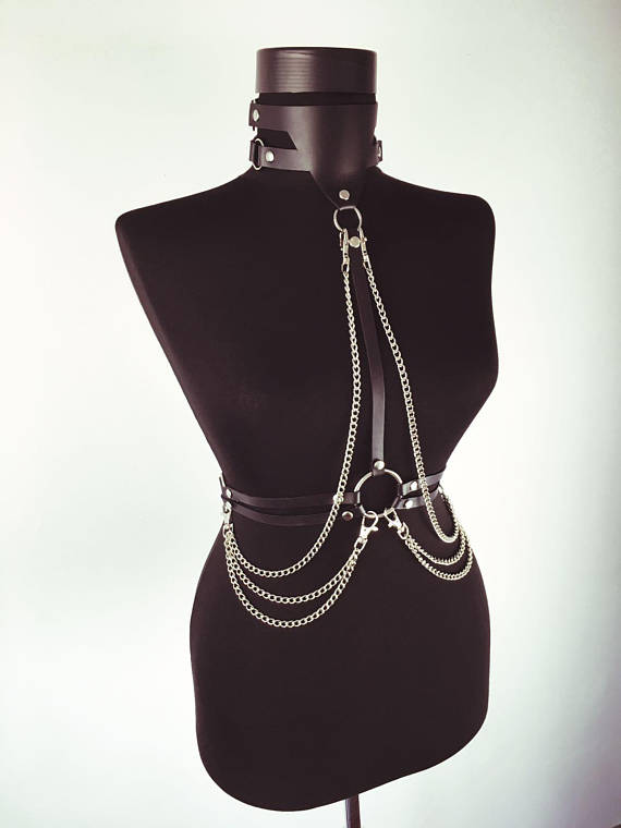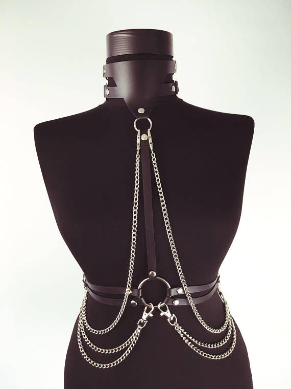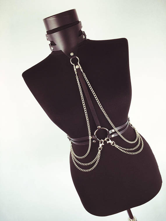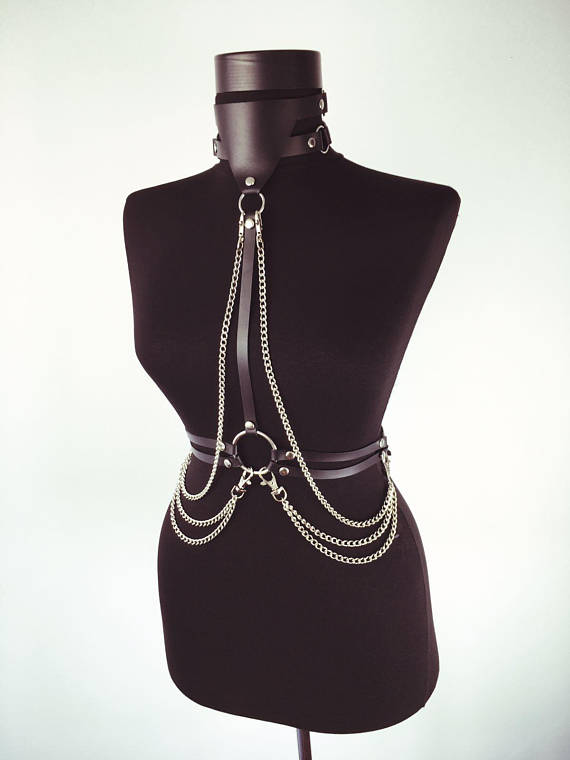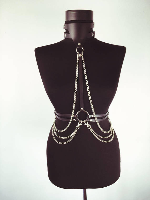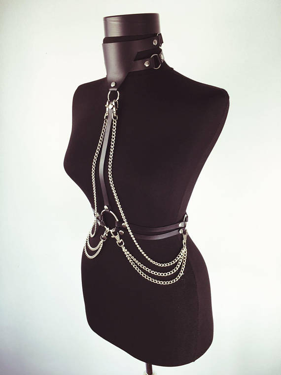BDSM Δερμάτινο γυναικείο τοπ με περιλαίμιο και με αλυσίδες. Διαθέτει ένα λαιμοδέτη σε τριγωνικό σχήμα που καταλήγει σε δυο δεσίματα στο λαιμό, ένα κάθετο λουρί φάρδους 1,5 cm που ενώνεται στη μέση σε μεταλλικό κρίκο. Στη μέση σαν ζώνη ξεκινούν 2 λουράκια με προσαρμοζόμενες τόκες από πίσω. Σαν έξτρα αξεσουάρ έχει 2 αλυσίδες από το λαιμό έως τα πλάγια και 2 διπλές αλυσίδες από τον κεντρικό κρίκο στη μέση που καταλήγουν επίσης στα πλάγια. Ένα εξαιρετικό αξεσουάρ στο κορμί σας.