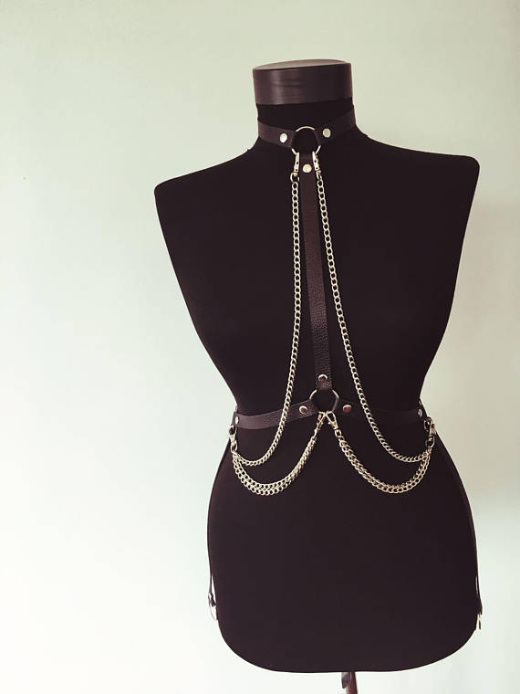 BDSM Δερμάτινο γυναικείο τοπ με διακοσμητικές αλυσίδες. Διαθέτει περιλαίμιο με κρίκο και κάθετο λουρί φάρδους 2 cm με κατάληξη σε κρίκοπου είναι στην μέση. Δύο διακοσμητικές αλυσίδες που ξεκινούν από το λαιμό και καταλήγουν στα πλάγια και δύο από τη μέση με κατάληξη επίσης στο ίδιο μέρος. Σας ομορφαίνει για τις "άγριες στιγμές σας"!