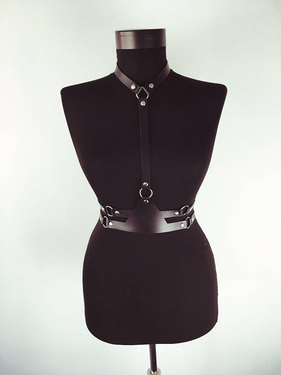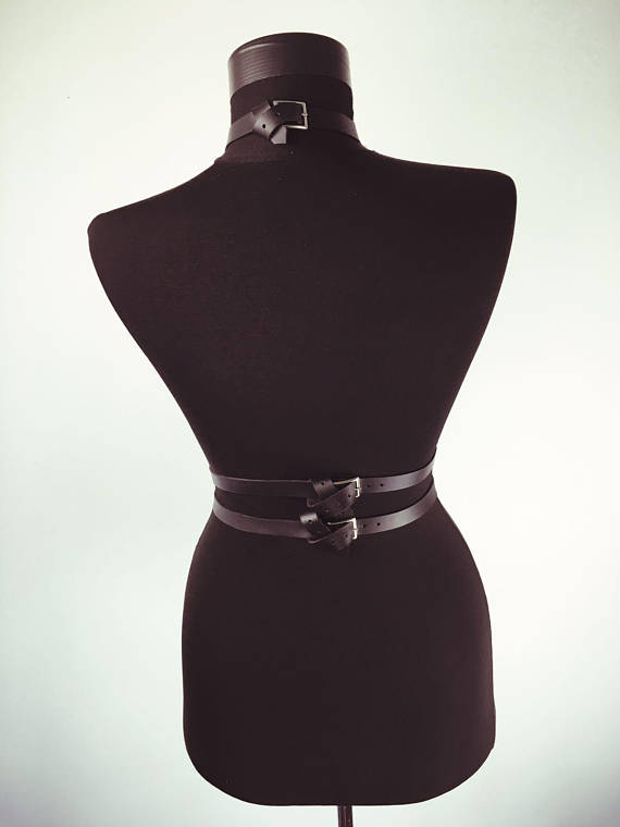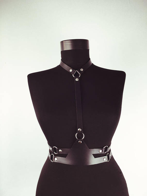 BDSM Δερμάτινο γυναικείο τοπ. Διαθέτει περιλαίμιο με μεταλλικό κρίκο στο κέντρο. Ένα κάθετο λουρί φάρδους 2 cm με κατάληξη στη μέση σε τριγωνικό σχέδιο και με δύο δεσίματα στη μέση. Όμορφο αξεσουάρ στο κορμί σας για πιο ιδιαίτερες εμφανίσεις!