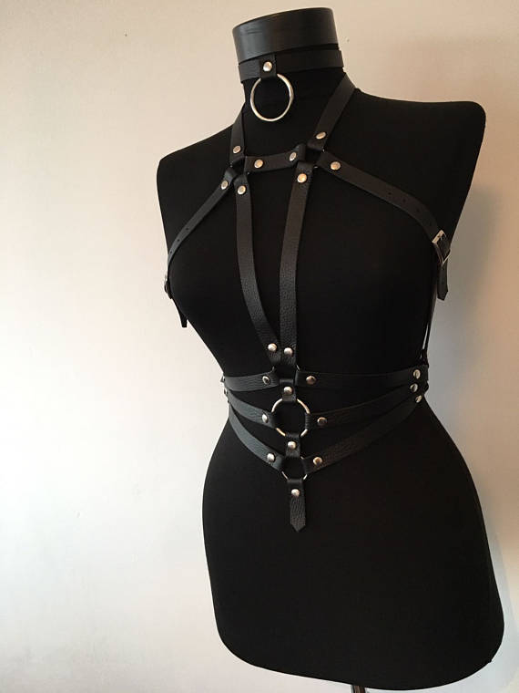 BDSM Δερμάτινο γυναικείο τοπ. Διαθέτει περιλαίμιο με μεταλλικό κρίκο και δύο κάθετα λουριά φάρδους 2 cm. Έχει ένωση πάνω από το στήθος, ζώνη με 3 μεταλλικούς κρίκους και 3 λουριά που ενώνονται στα πλάγια. Ένα αξεσουάρ στο κορμί σας για τα φετιχιστικά σας παιχνίδια.