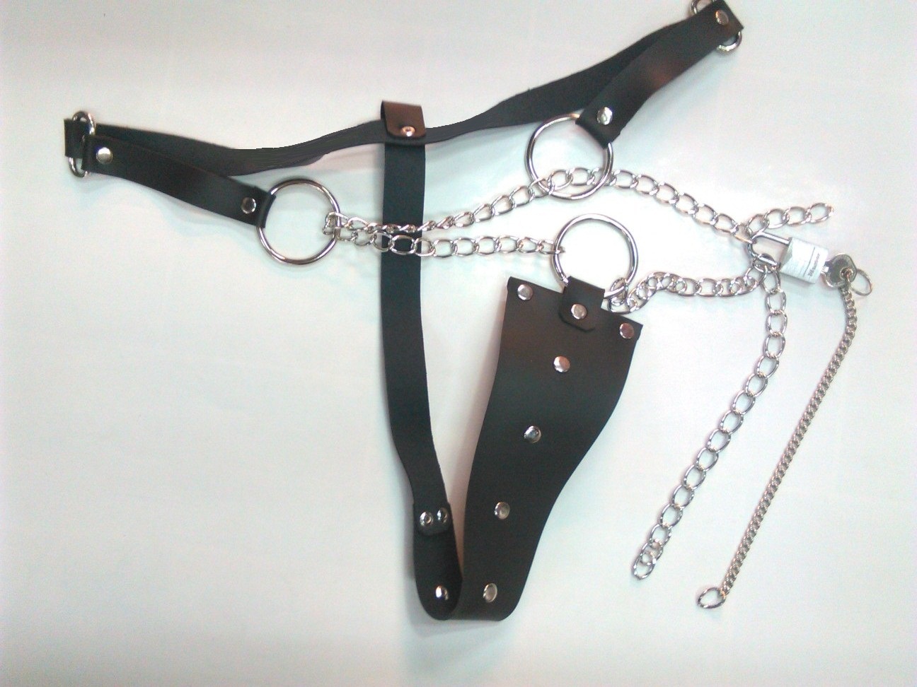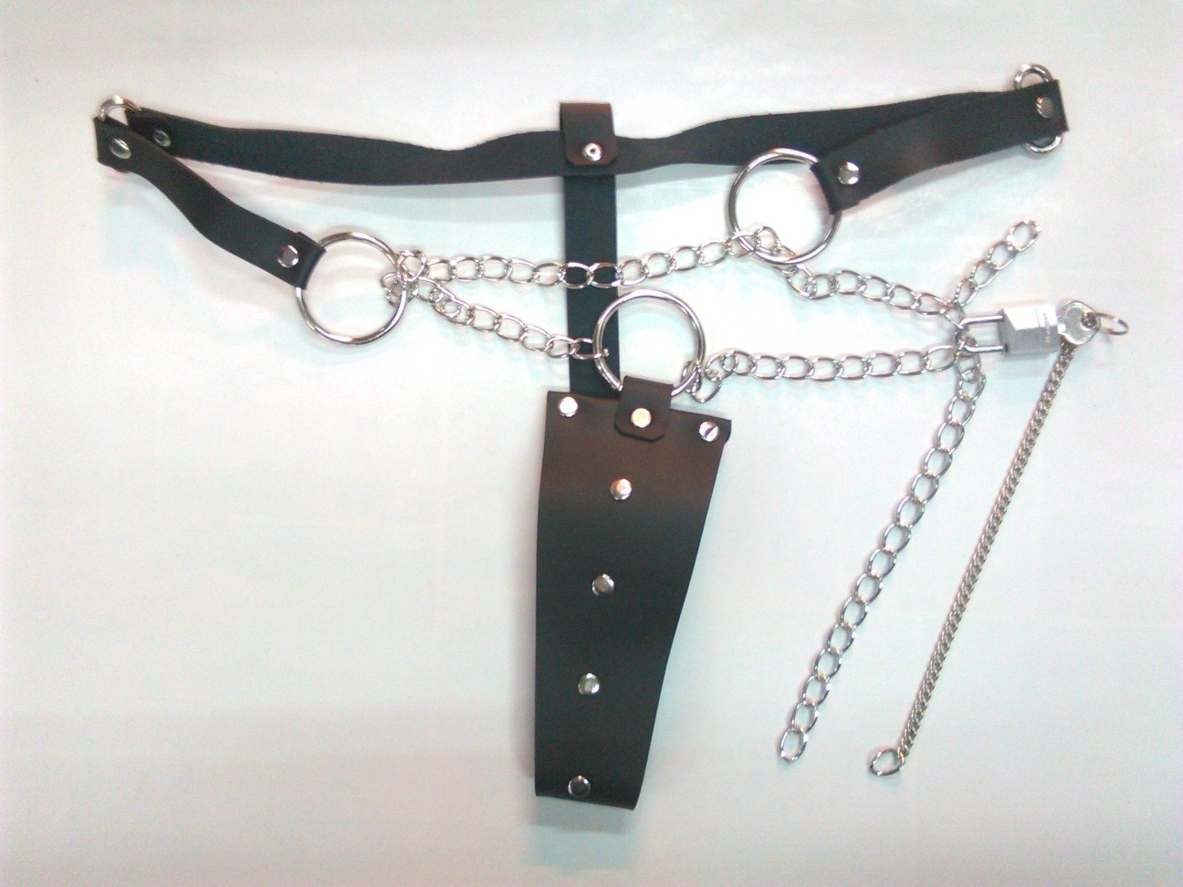 BDSM Δερμάτινο γυναικείο  στρινγκ με αλυσίδες και με διακοσμητική κλειδαριά. Έχει τριγωνικό κάλυμμα μπροστά με τρουκς και μεταλλικό κρίκο επάνω από όπου περνάει η αλυσίδα με την κλειδαριά για να το ανοίγεται όταν εσείς θελήσετε. ένα παιχνίδι που θα εξιτάρει και θα εκτινάξει την αδρεναλίνη του συντρόφου σας αφού δεν θα μπορεί να έχει πρόσβαση σε αυτό που επιθυμεί, παρά μόνο όταν εσείς το θέλετε.