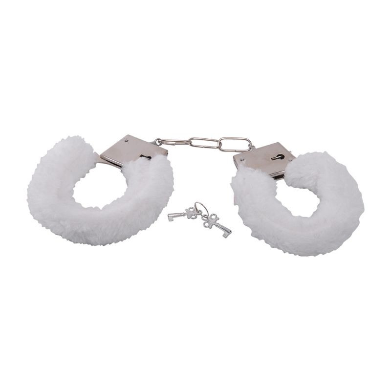 Χειροπέδες με άσπρο γουνάκι. Περιλαμβάνουν κλειδιά για άμεση απελευθέρωση και κουμπί σε περίπτωση που τα χάσετε και ρυθμίζονται ανάλογα με τον καρπό του καθενός. Παιχνίδι εξουσίας με " αγνά " αισθήματα...