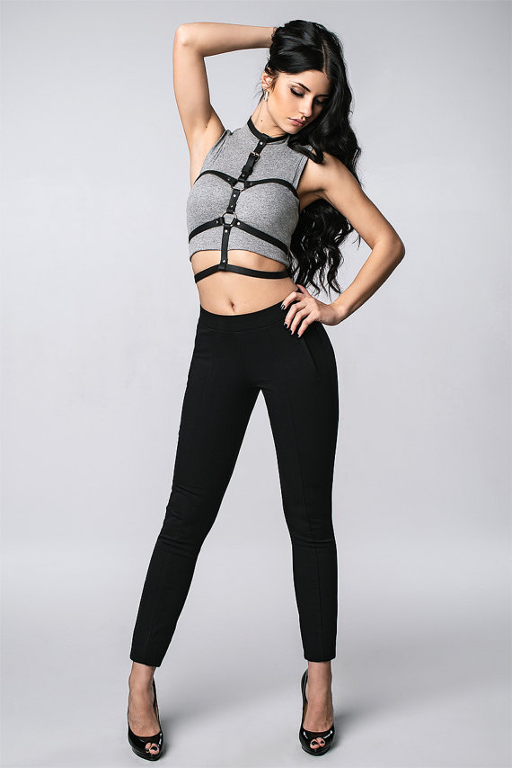 BDSM Δερμάτινο γυναικείο τοπ με περιλαίμιο. Το περιλαίμιο και τα 3 οριζόντια λουριά ενώνονται με ένα κεντρικό κάθετο λουρί φάρδους 2 cm. Μπορείτε να το φορέσετε ακόμη και σε μια έξοδο σας πάνω από τα ρούχα! Για αυτούς που ακολουθούν την μόδα!