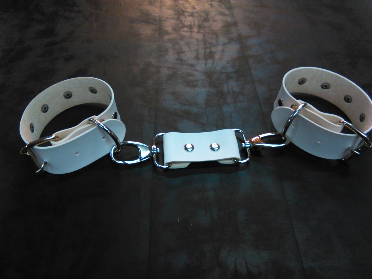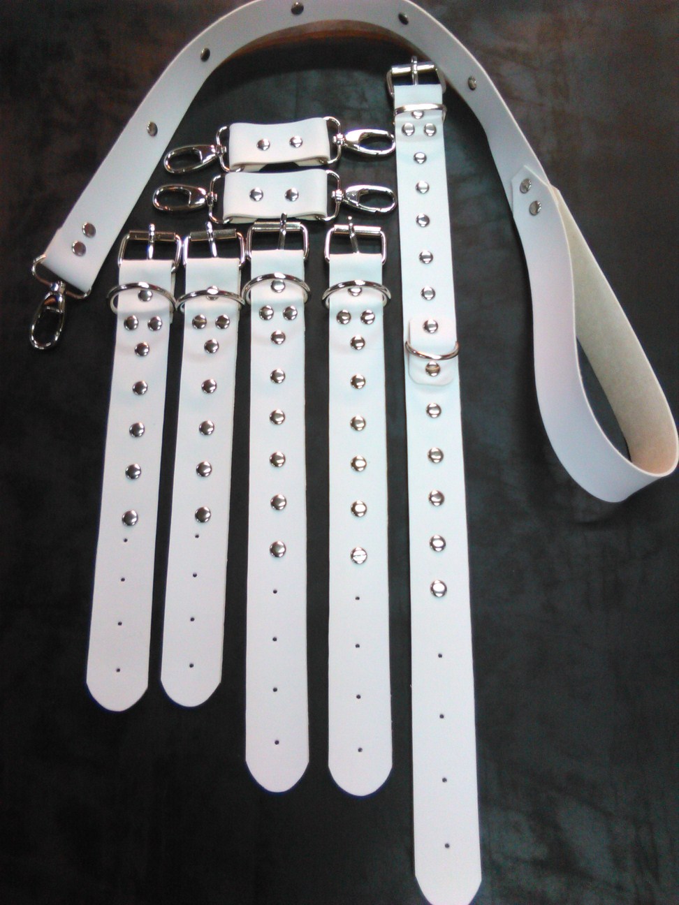 BDSM Λευκό δερμάτινο σετ που περιλαμβάνει 4 χειροπέδες για τα χέρια-πόδια, ενωτικούς γάντζους και ένα περιλαίμιο με λουρί. Έχουν διακοσμητικά τρουκς σε όλη την επιφάνειά τους. Ένα πολυσύνθετο και πολυδιάστατο σετ δεσίματος για πολλές εναλλαγές στα ερωτικά παιχνίδια σας!