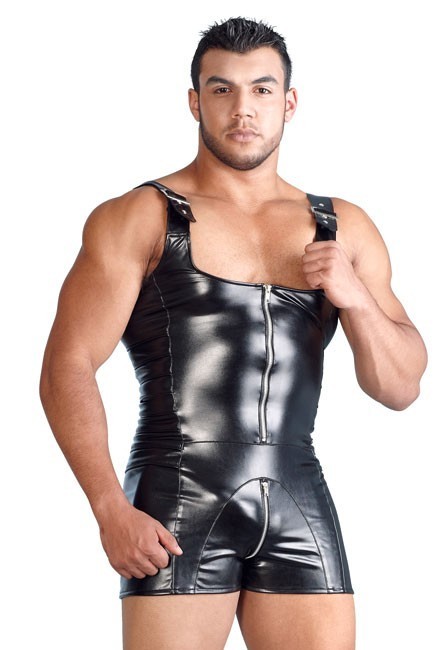Black overall in biker style that is fitted at the sides, adjustable straps and highlighted zip on the chest and crotch.
