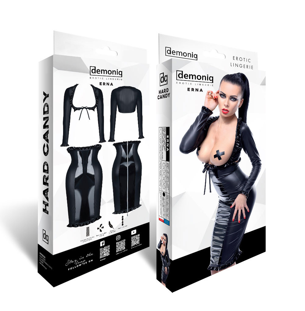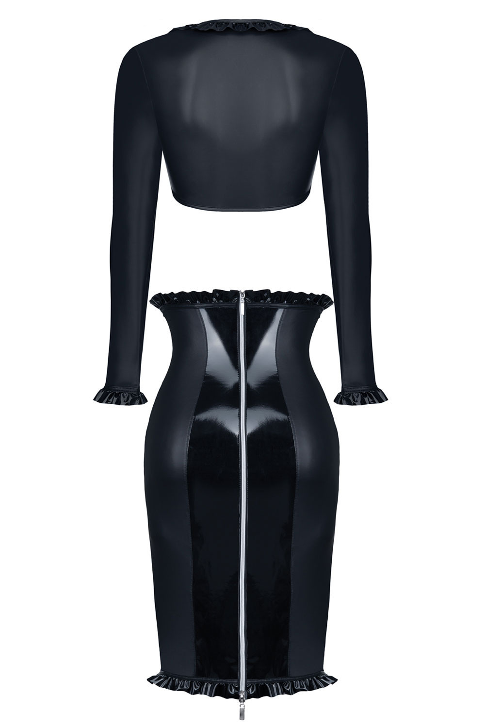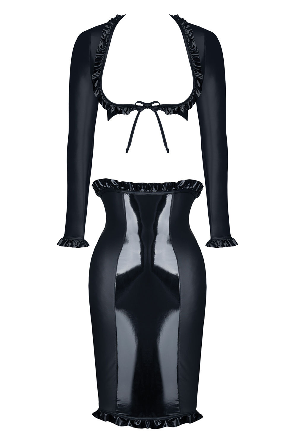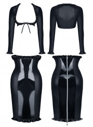 Demoniq Erna is a complete wetlook set which includes a long skirt with zipper at the rear and a blouse laced under the breasts.