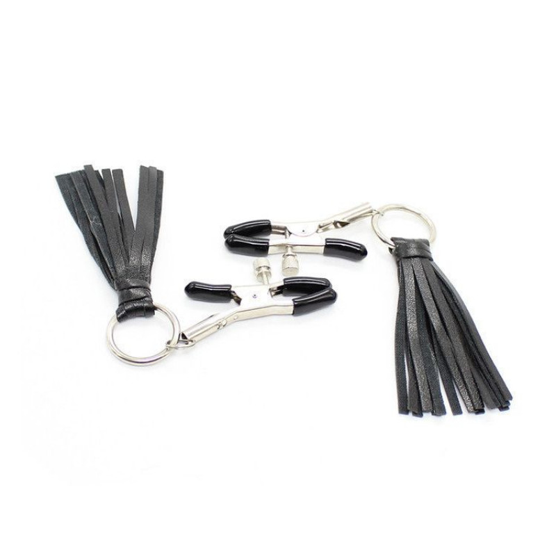 Nipple clamps with adjustable pressure joined by a metal chain. There are black ribbons attached to the clamps. For BDSM enthusiasts but also for beginners who wish to add an extra amount of excitement and fun to the intercourse.