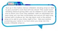 Το πρώτο στραπόν με ρυθμιζόμενη ζωνη βαριας χρησης με ενσωματωμένη ηλεκτρική αερο πομπίνα φουσκώματος του Ντίλτο ομοιώματος και επιπρόσθετα με δόνηση στο ομοίωμα για ακομη μεγαλύτερη απόλαυση κατα την είσοδο στον πρωκτό η στον κολπο. Ενα μεγεθος, ρυθμιζόμενη, δερμάτινη ζώνη. Το ομοιωμα διαθετει δονηση. Το σύστημα λαμβάνει 3 ΑΑ
