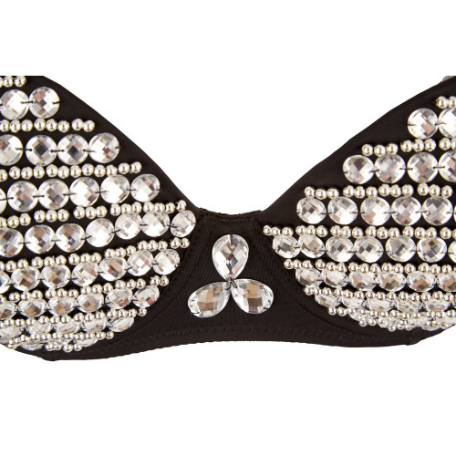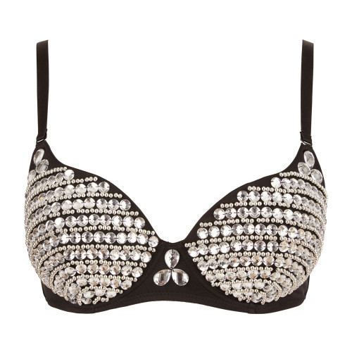 A real unique bra that covered with rhinestones all the way! You can wear it in a club instead your top or under a transparent top. The underwired bra with slightly padded cups and with small bones at either side and a hook-fastener at the back. The straps are adjustable and removable.