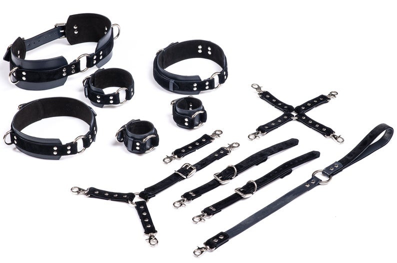 Δεσιματα σετ απο δερμα και υλικά αριστης ποιότητος και αντοχης. Αποτελειται απο Περιλαιμο, ζωνη φαρδια μέσης, χειροπέδες, δέστρες μοιρων και πολλα ενσωματομενα λουρια με κρικους και γαντζους που μπορουν να σας δωσουν πολλαπλες επιλογες σε παρα πολλα διαφορετικα δεσιματα. Ενα πληρες και εντυπωσιακο σετ, φινετσατο, αποτελεσματικο που τα περιεχει ολα.