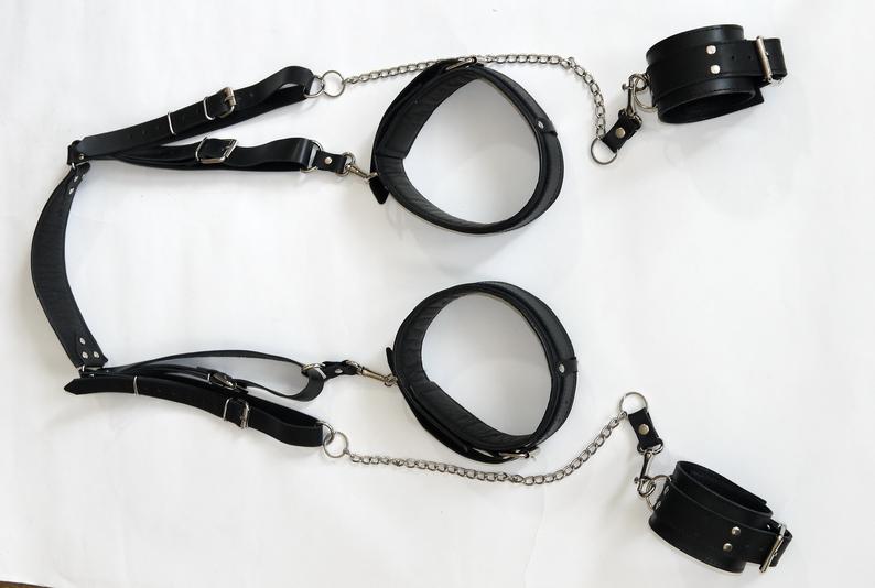 Δεσίματα σετ απο δερμα και υλικά, αριστης ποιοτητος και αντοχης. Διαθετει 2 δέστρες χεριων ή ποδιών και 2 δέστρες για τους μοιρους. Επισης φαρδυ λουρι γυρω απο το σβέρκο με λουρια ρυθμιζωμενα ετσι ωστε να πιανουν τα ποδια ή και τα χερια. Ενα ποικιλόμορφο σετ δεσιματος,για πολυ δυναμη, ιδιαιτερο και απαιτητικό.