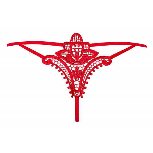 Hot red string with a simple front and a delicate embroidery at the back. With stretchy straps on both sides.